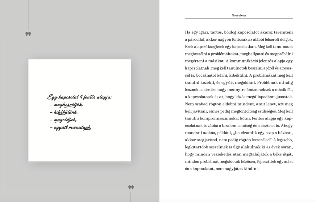 5 nagy fejezetre oszlik a könyv, és 50 témát érint röviden kifejte, pszichológusok által alátámasztva.